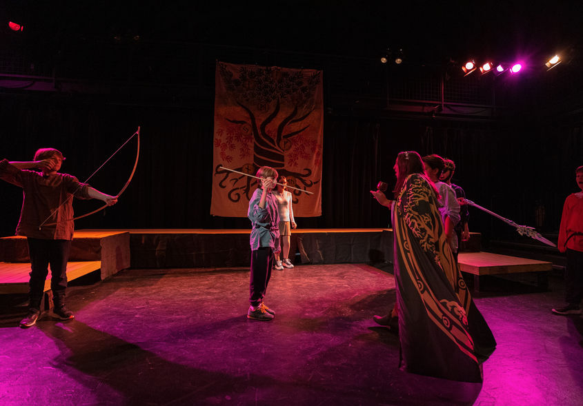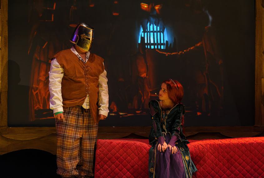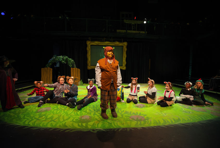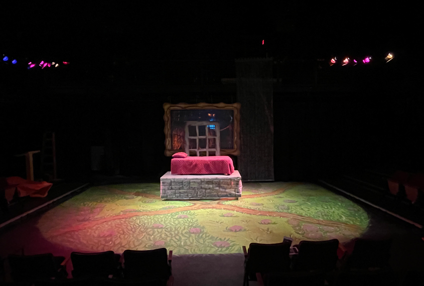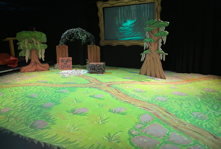 The set was designed to look like a children's fairy-tale "pop-up" picture book. Foam set pieces had to be light enough to be moved by 10 year old stage-hands but also stable enough to not be damaged by young hands. The flooring needed to read as both swamp, forest, and dungeon floor under different lighting.