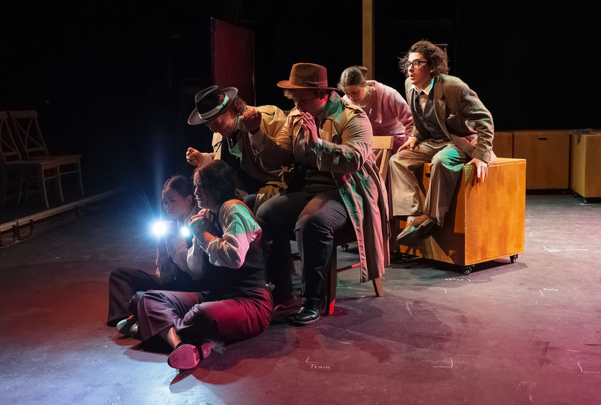 This minimalist set was to designed to look like a rehearsal space. Spike marks were painted onto the floor and set pieces were kept minimal and painted to look like untreated, distressed wood. In contrast to the minimalist set, the show heavily relied on lighting and sound effects to recreate the feel of the 1930s Hitchcock spy thriller and boasted a final count of 129 sound cues.