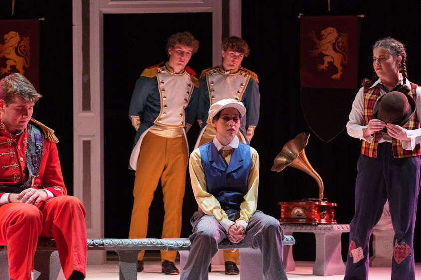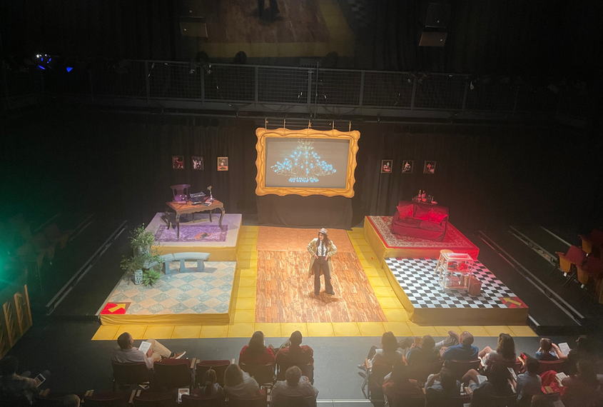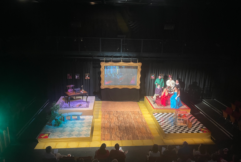 This version of the show relied heavily on quick changes with the use of moveable "floor to ceiling" windows. The floor was painted to both resemble a formal indoor marble floor and an outdoor garden with manicured stones. Projected images placed the quick setting changes with the help of a bespoke 10'x6' faux gilded picture frame .